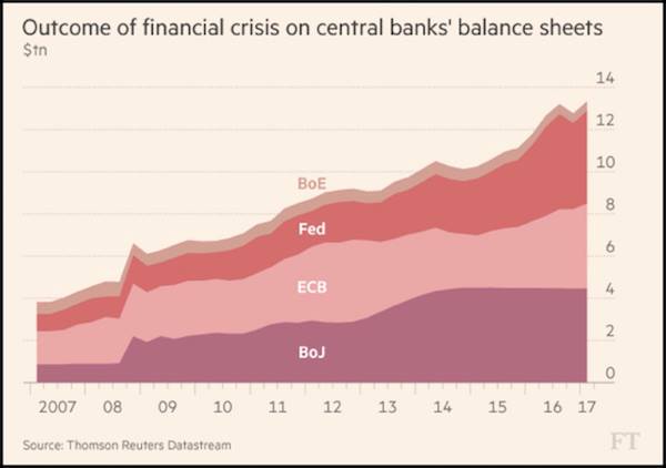 Ainsi, à ce moment-ci, les 4 plus grandes banques centrales ont accumulé (i.e. acheté) 13 000 G$ (13 000 milliards de $) « d’hypothèques toxiques », dont elles sont propriétaires et qui apparaissent dans leurs bilans financiers, et dont elles désirent se départir en les « revendant » sur le marché financier, bien souvent à perte. De ce fait, les régimes de retraite, les fonds souverains, les fonds d’investissement (tel Blackrock et Berkshire Hathaway),… vont « acheter » ces hypothèques vendues par les banques centrales et, de ce fait, diminuer les liquidités dont elles disposent et qui ne leur procurent qu’un faible rendement.