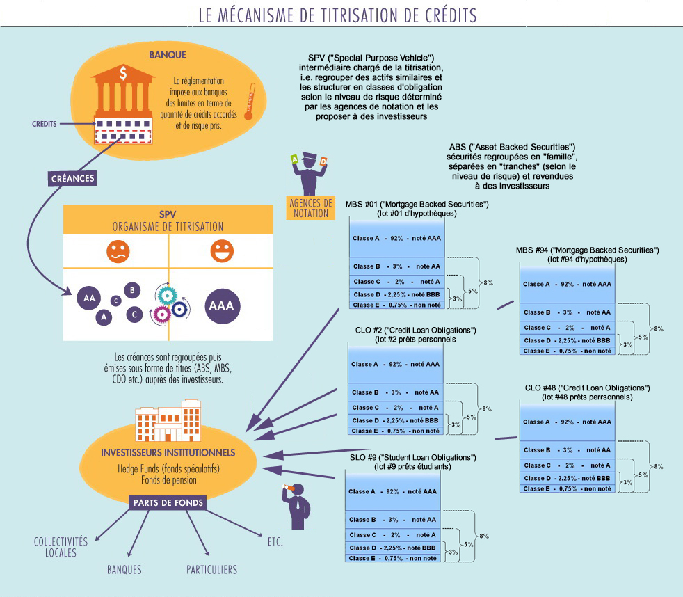 Pour ajouter à la compréhension de la « mécanique », précisons que les créances sont regroupées au sein d’une même famille (« lot ») et que chaque lot est découpé en « tranches », chacune ayant une cote de crédit attribuée par une agence de notation et représentant la « qualité » des créances sous-jacentes. Les tranches sont acquises individuellement par les investisseurs selon le rendement propre à chacune de celles-ci eu égard au niveau de risque qu’elles présentent.