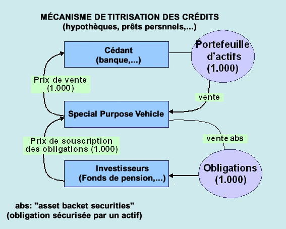 - dans un premier temps, le cédant (banque, agence gouvernementale,…) cède un portefeuille d’actifs à un intermédiaire qui se chargera de les écouler auprès d’investisseurs privés