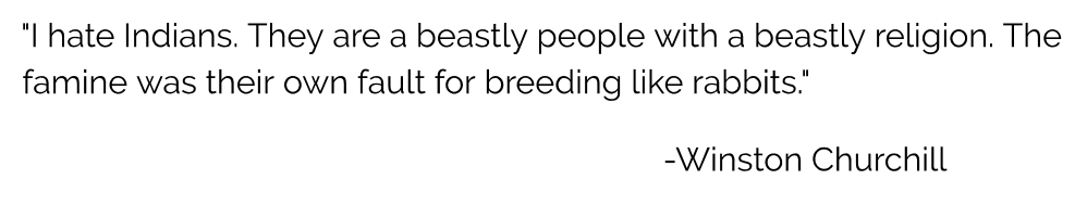 [Traduction libre: « Je déteste les Indiens. Ce sont des barbares qui pratiquent des rites bestiaux. Ils sont responsables de leur famine en s’accouplant comme des lapins »]