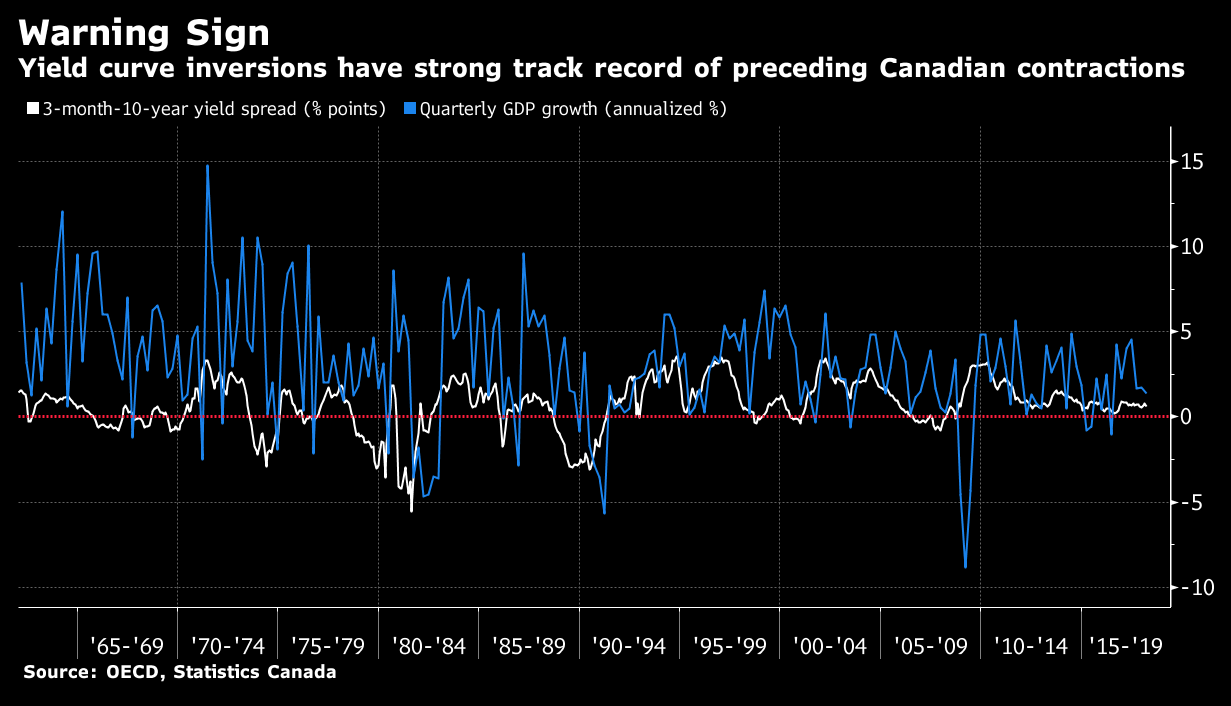 Cependant, lorsque les rendements s’inversent (rendement consenti, pour les emprunts long terme, moins élevés que les rendements consentis pour les prêts court terme) alors quelque chose ne tourne pas rond. Et, dans l’historique canadien des rendements obligataires (de 1965 à ce jour), chaque période où il y a eu « inversion » dans les rendements obligataires a coïncidé avec une période de récession et de croissane négative du PIB.
