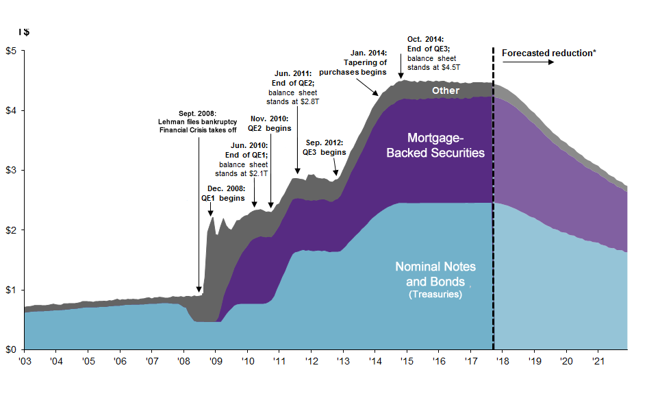 De plus, les augmentations des taux de base « collaborent » avec une stratégie consistant à « revendre » sur le marché – à prix escompté – les hypothèques à très haut risque (« hypothèques subprimes ») acquises par la FED durant la crise financière de 2008-2009. Cette seconde stratégie, initiée en 2017, a également pour effet d’induire une « poussée à la hausse » sur le rendement pour les obligations long terme du marché obligataire: