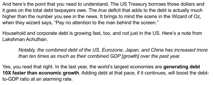 Or, il a été démontré que, afin de maintenir la croissance du PIB, de nouvelles dettes doivent être constamment contractées… alors que ces nouvelles dettes ajoutent plus, à l’endettement global, que les bénéfices engendrés par la croissance du PIB.