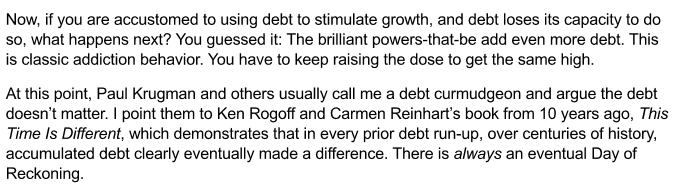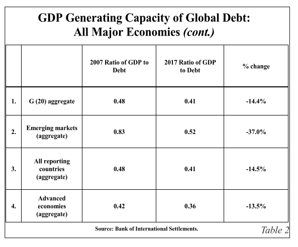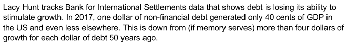 Selon la compilation de Lacy Hunt relatée dans le commentaire de John Mauldin, alors que, dans les années 70, chaque 1 $ de nouvelle dette résultait dans une augmentation de 4 $ du PIB (endettement très structurant), aujourd’hui chaque 1 $ de nouvelle dette ne résulte que dans 0,40 $ d’accroissement du PIB alors que nous connaissons, aujourd’hui, des rendements décroissants sur tout nouvel endettement destiné, selon nos dirigeants, à « augmenter la richesse collective » de la population: