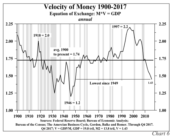Les analystes financiers de Hoisington Investment nous présentent cette compilation de la « vélocité de la monnaie » de 1900 à ce jour alors que, en 2017, la « vélocité de la monnaie » rejoint la valeur établie en 1949: