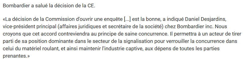 Cela étant, prenant acte de l’intention de Siemens et d’Alston de mettre en commun leurs unités de production, alors que le dossier était acheminé à la Commission européenne chargée de la concurrence, Bombardier s’employait plutôt à se livrer à un « combat d’arrière garde » par des interventions auprès de celle-ci: