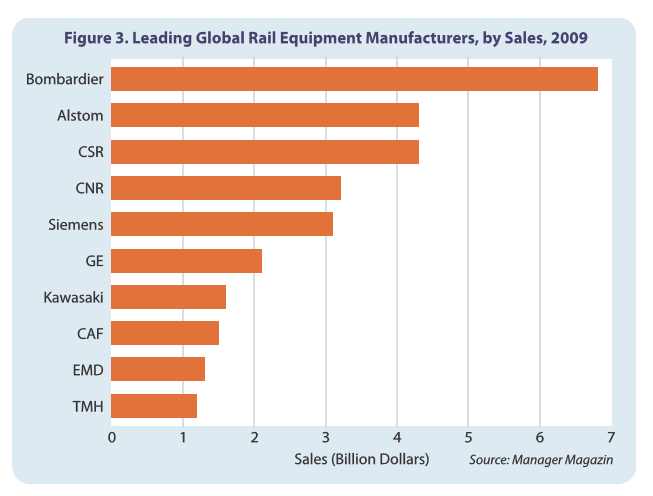 Bombardier occupait en 2009 le 1er rang, à l’échelle mondiale, pour la production de matériel ferroviaire, largement en avance sur ses compétiteurs tel Alstom, CSR, CNR, Siemens,… tel qu’en témoige cette analyse compilée par le Wordwatch Institute: