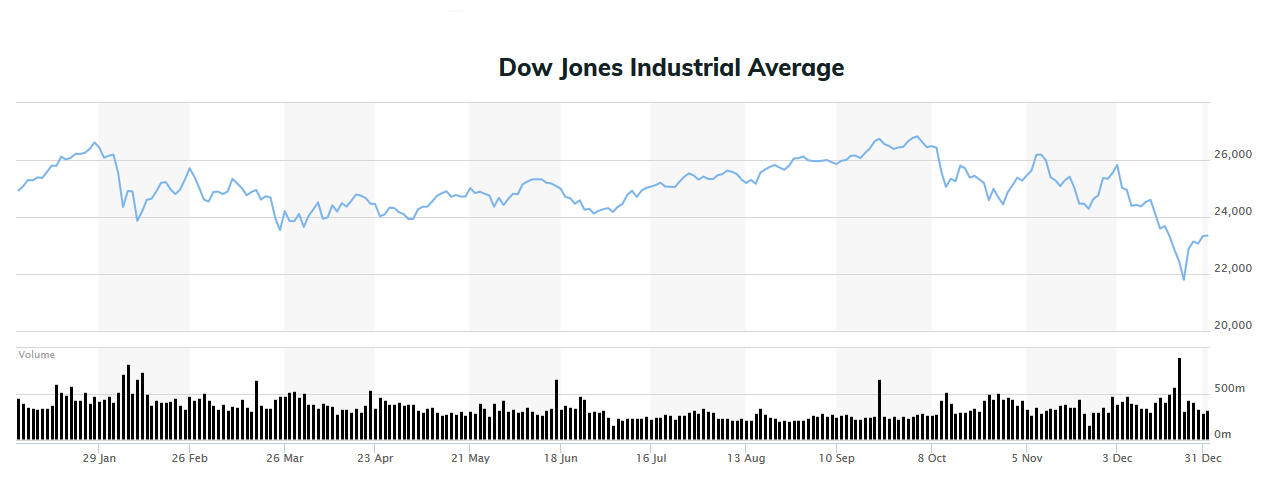 Une chute des marchés boursiers entamée en octobre avec une forte accélération durant le mois de décembre, alors que le site d’information financière Bloomberg faisait état de la pire chute du marché boursier – durant la période précédant le congé de Noël – dans son édition du 24 décembre: